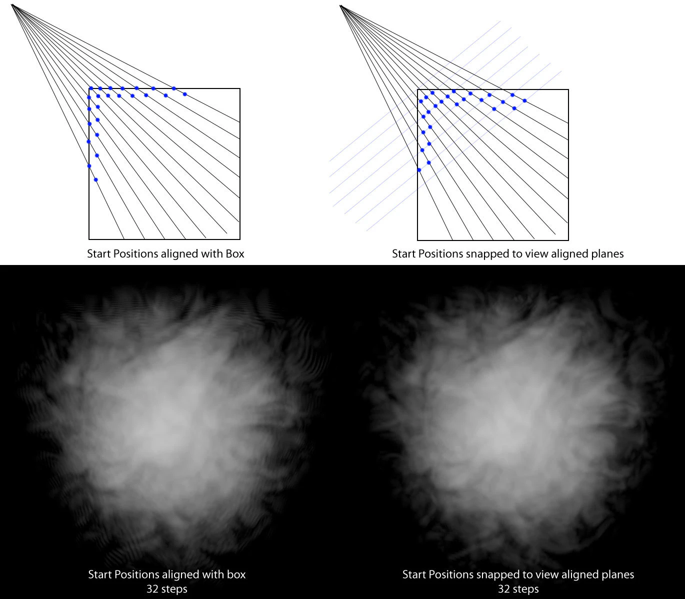 視点に整列した平面に開始位置をスナップさせるとアーティファクトを軽減することができます。