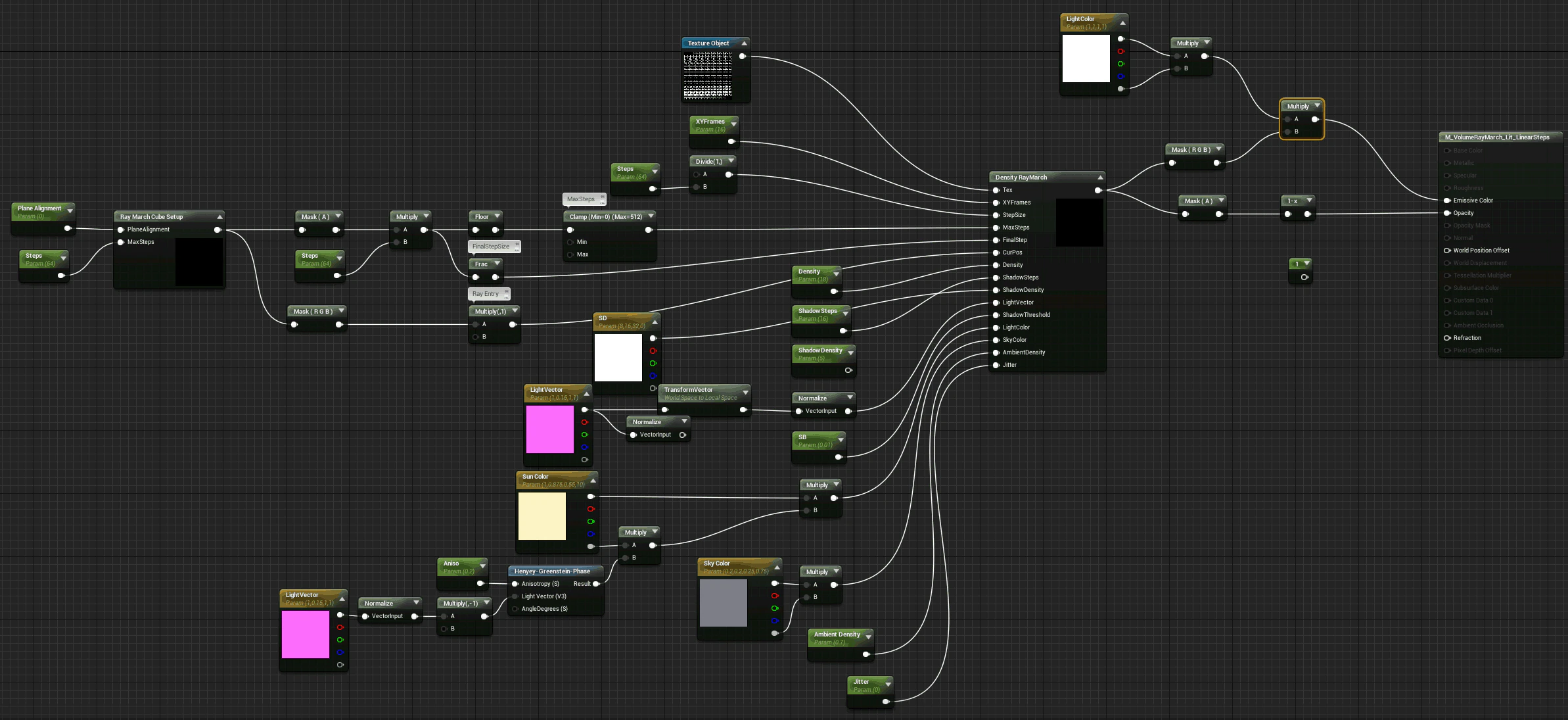 フェーズ関数がディレクショナルライトだけに分離され、アンビエントライトに影響を与えないようにするために、レイマーチャの出力側ではなくこの方法で行われました。