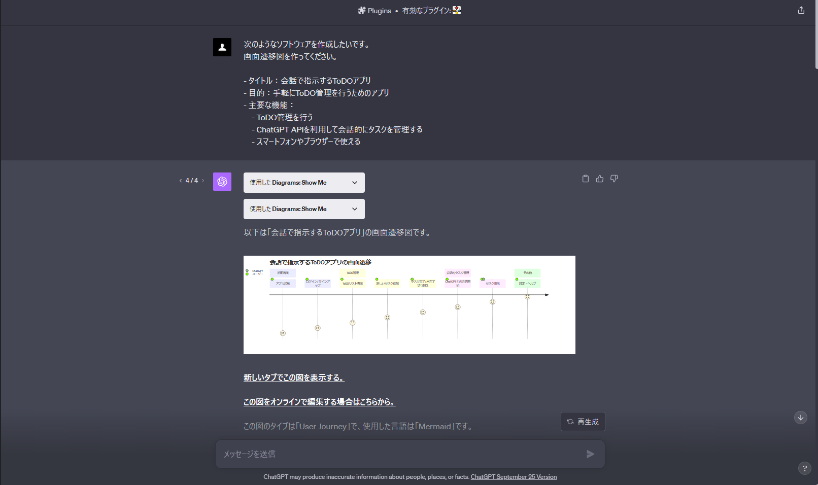 画面遷移図の作成を指示すると、ChatGPTが以下の通り作成してくれる。