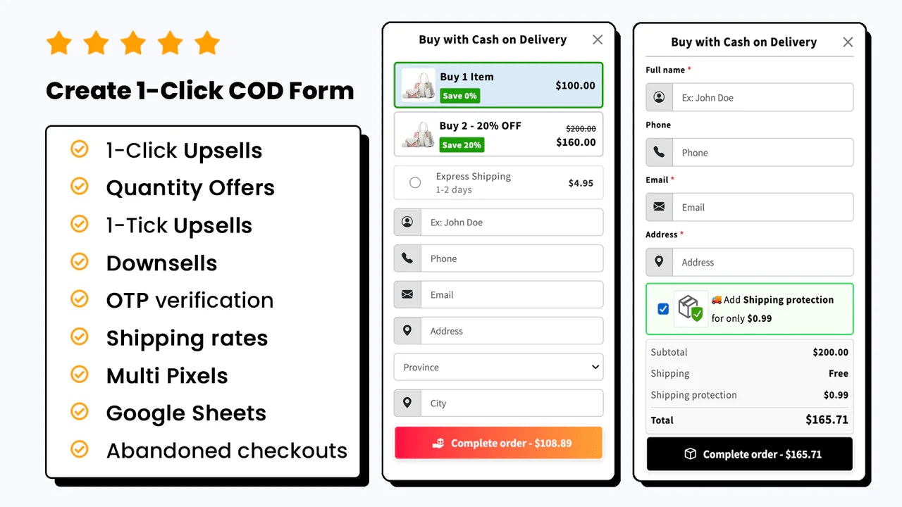 このアプリは、代金引換(COD)フォームをカスタマイズし、アップセル機能まで一気通貫で利用できる 点が魅力です。注文画面をシンプルなフォームに置き換えながら、商品数を増やす数量オファーや追加購入を促すクロスセルなどを配置可能。さらに複数のピクセル管理にも対応しており、FacebookやTikTokなど各広告プラットフォームでのコンバージョン追跡を強化できます。「一度の注文で客単価を最大化したい」 と考えているストアにおすすめです。