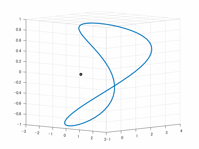 図の中の ● は、原点 (0, 0, 0)です。動画がいまひとつカクカクしていて、頼りないのはお許しくださいませ