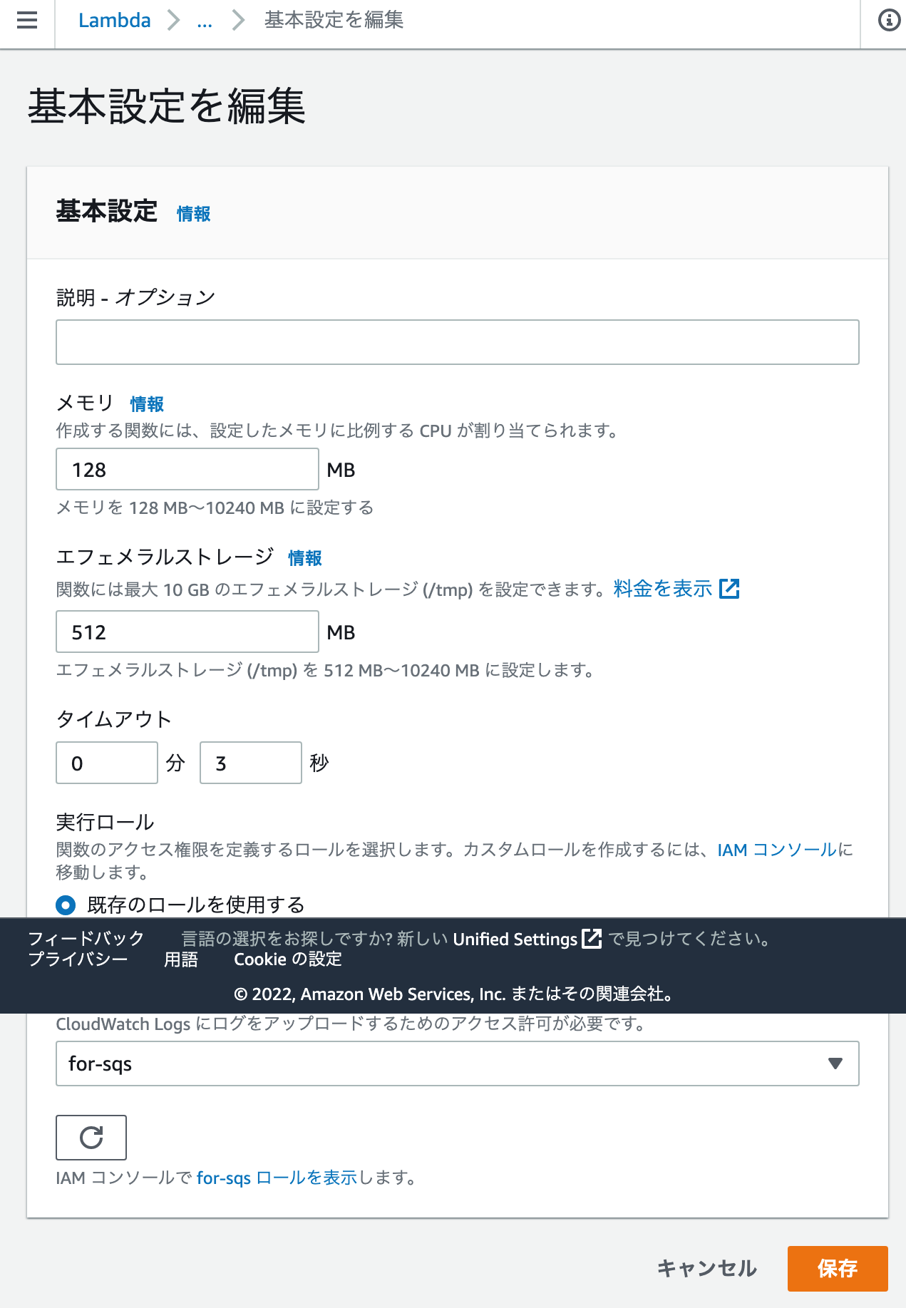 コンロールのlambdaのページを開き、設定タブ > アクセス権限 > 実行ロール > 編集ボタンで設定します。