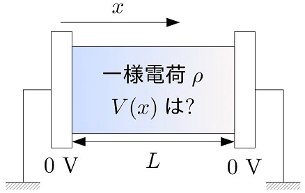 図ように,一様に帯電した十分に広く厚さ$L$の板があり,これを2枚の接地(アース)した導体電極で挟みます(アースした部分の電位は0 V).板内の一様な電荷密度を$\rho$として,1)板内電位を求めよ.