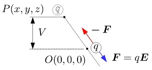 このクーロン力に逆らって,電荷を原点$O$から$\bm{r}=(x,y,z)$の点Pまで動かすときに必要な仕事$V$は