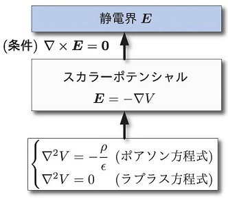 となります.ベクトル解析によると,この関係は常に成立します.したがって,$\nabla \times \bm{E}=\bm{0}~$の場合にのみ$\bm{E}=-\nabla V$から$\bm{E}$を求めることができる,という制約がついてきます.