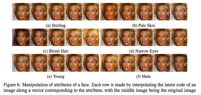 画像の属性を修正すること考える。そのために、CelebAデータセットのラベルを使用する。各画像は、笑い、ブロンドヘア、若い、などの属性があるかないかを示す2値のラベルがついている。各属性について30,000個の2値ラベルがあることになる。ある属性を持つ画像については潜在変数の平均$\boldsymbol{z_{pos}}$を、持たないものは$\boldsymbol{z_{neg}}$を計算し、操作の方向として差$(\boldsymbol{z_{pos}}-\boldsymbol{z_{neg}})$を使用する。これは比較的小さい介入であり、モデルが訓練された後に行う(訓練中にラベルは使用しない)。これにより、多様な属性に対して行うことが簡単になる。結果は図6。