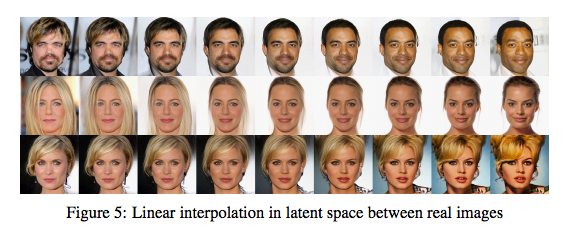 結果は図5であるが、ジェネレータ分布の画像多様体は極めてなめらかであり、ほとんどすべての中間サンプルは本物の顔に見える。意味のある潜在空間を構築できた。