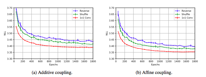 CIFAR-10(Krizhevsky,2009)で、負の対数尤度(bits per dimension)の平均を比較した。3つのランダムシードを平均して、すべての訓練の条件を一定にした。結果は図3。**加法的、アフィンどちらの場合も、他の置換方法よりも可逆1x1convの負の対数尤度は低く、収束が早いことがわかる。**また、アフィンの場合は加法的モデルよりも収束が早い。可逆1x1convで増えた計算時間はおよそ7%に過ぎなかったので、この操作も計算効率が良いと言える。