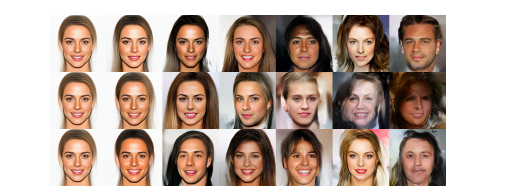図6:属性の操作。各行は画像の潜在コード(潜在空間に写像された画像のベクトル)を特定の属性に対応するベクトルに沿って補完することで作成した。中間の画像がオリジナル。