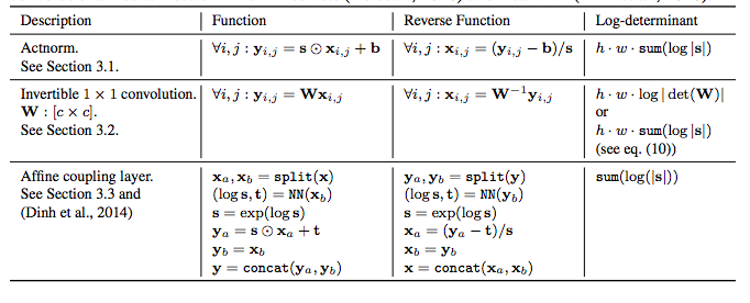表1: 提案したflowの主要な要素について、関数、逆関数、log-determinantを示した。$\boldsymbol{x}$はレイヤの入力、$\boldsymbol{y}$は出力。$\boldsymbol{x},\boldsymbol{y}$とも、[$h \times w \times c$]のテンソル。$\boldsymbol{x},\boldsymbol{y}$内の空間的な位置を$(i,j)$で表す。関数NN()は**ResNets (He et al., 2016)やRealNVP (Dinh et al., 2016)**に見られる浅いCNNのような非線形写像。
