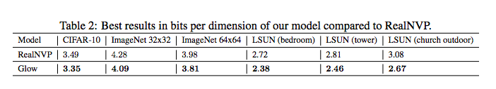 表2:bits/dimensionでRealNVPと比較した本モデルの性能