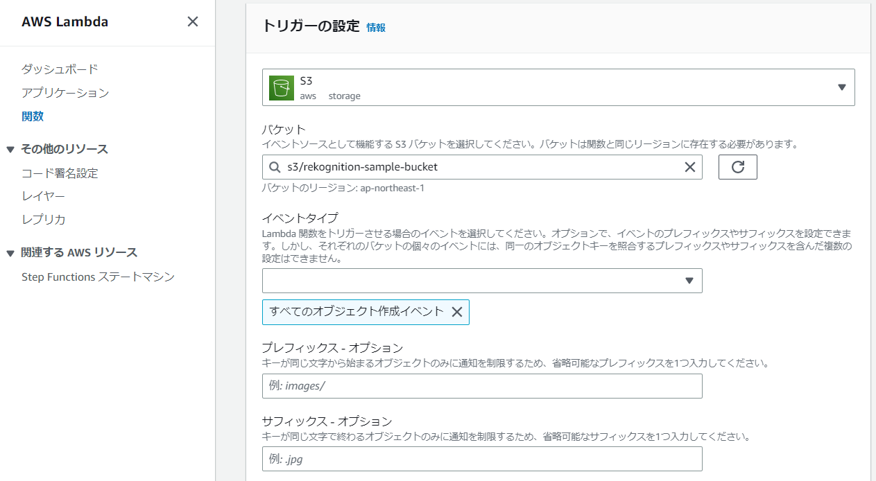 また今回は、画像がアップロードされたタイミングで実行したいので、イベントタイプは「すべてのオブジェクト作成イベント」を選択します。