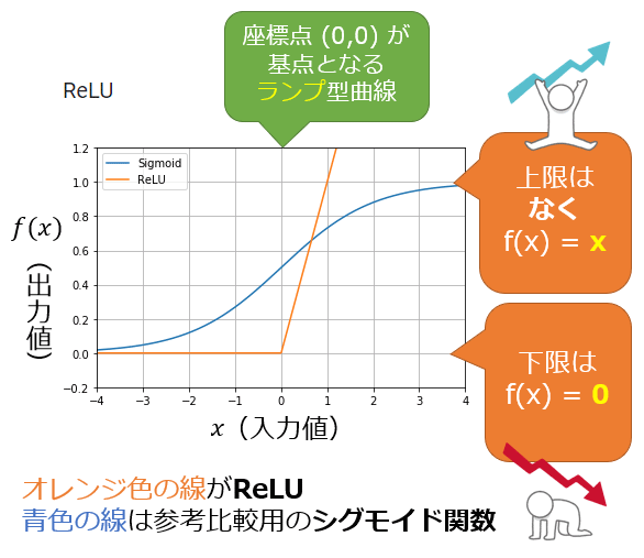 - シグモイド関数は「-1」〜「1」しか出力を行わないが、ReLU関数は上限がない関数なので、その分学習の速度が早くなる、また計算式がシンプルであるのも早くなる理由である
