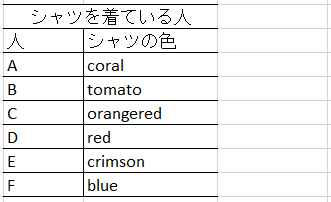 A~E の人の似たような色のシャツについてまとめてしまって次のようにしたほうが都合がよい場合があります。