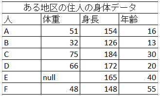 十分に数が揃えばよいデータの場合、データがとれていない、失った、などで欠損が見られるときは、その欠損値をもつ行を削除するという処理が考えられます。この場合はEさんの行を削除してしまえばデータセットとしての形が揃います。ただしサンプル数が少ない場合にはデータの再取得を試みるべきかもしれません。