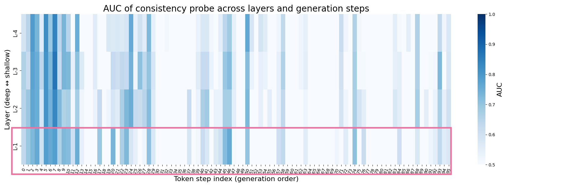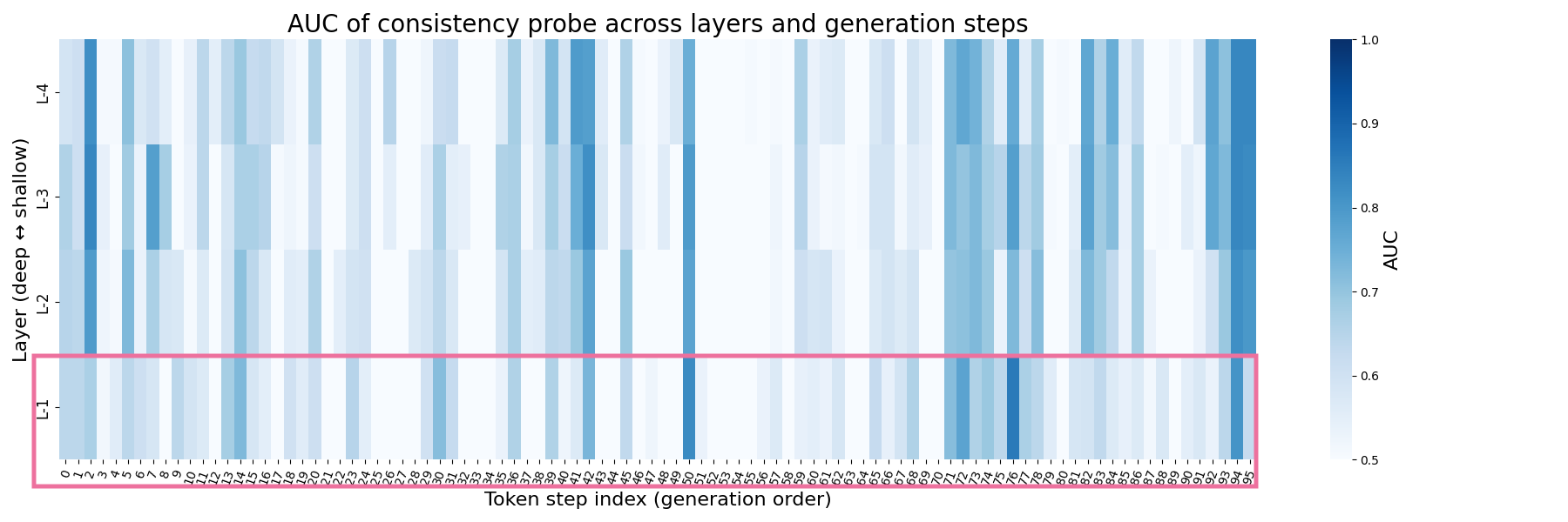 赤枠で囲んだ最終ブロックに注目すると、下のトップモデルは特定のトークン位置(50番目、76番目など)において色が濃く(AUC > 0.8~0.9)なっていることから、妥当かどうかを強く判別できる情報を局所的に内包していると考えられます。