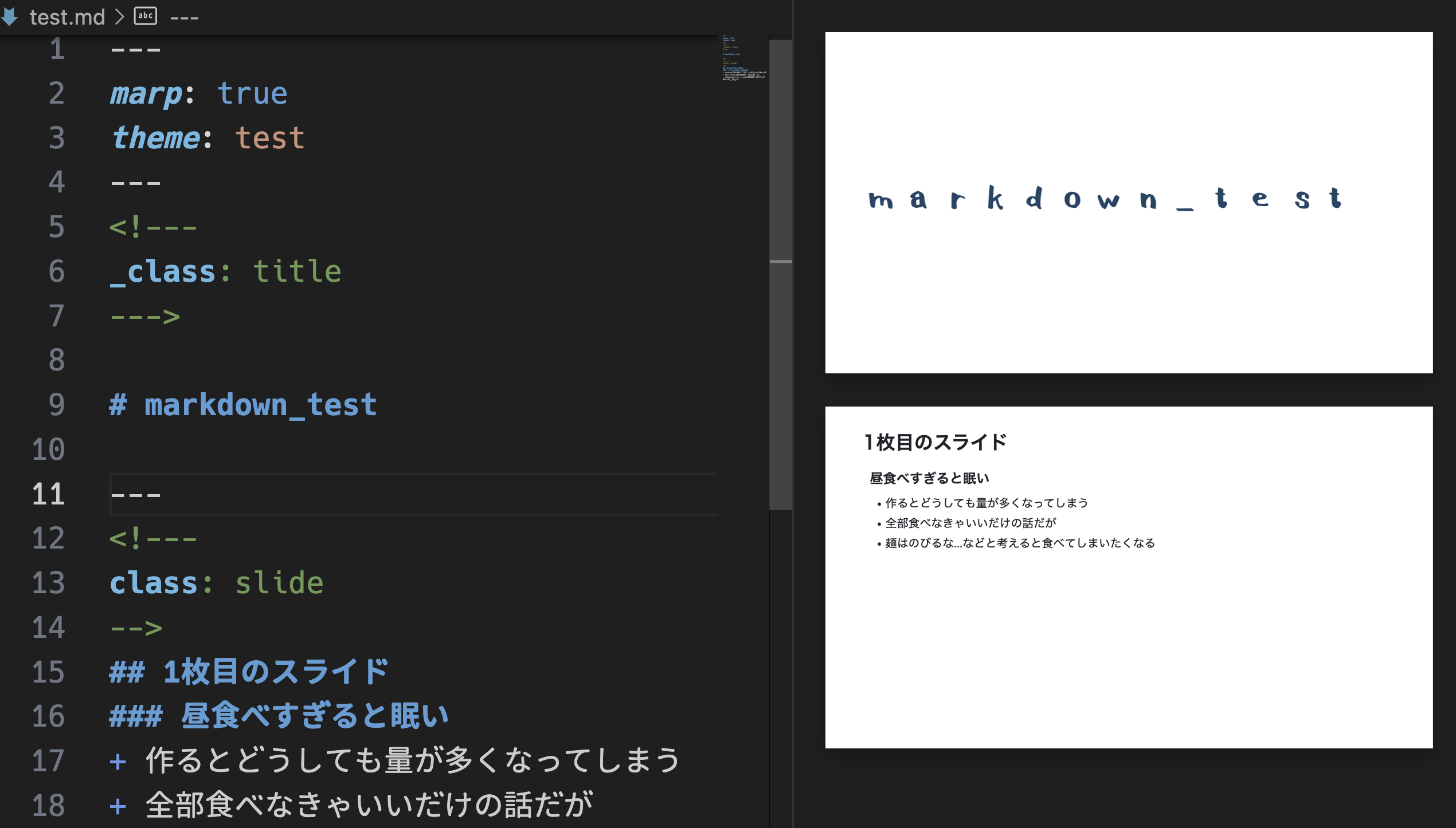この場合相対パス./marp_themes/test_theme.cssが示す先にちゃんとファイルがあるので、テーマが適用されてテーマで指定通りの体裁になったものがプレビューに表示されます。