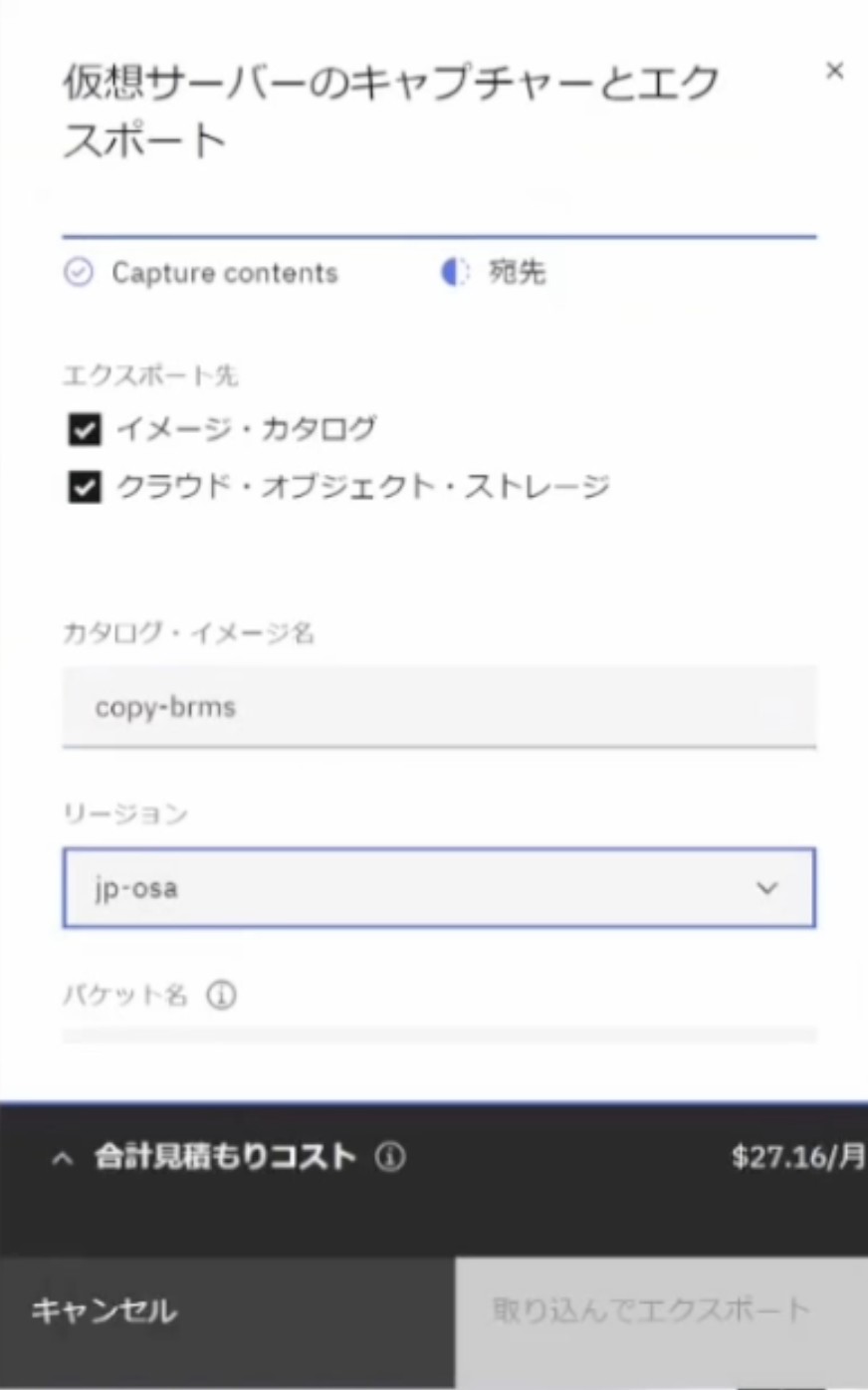 今回は「イメージ・カタログ」と「クラウド・オブジェクト・ストレージ(ICOS)」をエクスポート先として選びます。