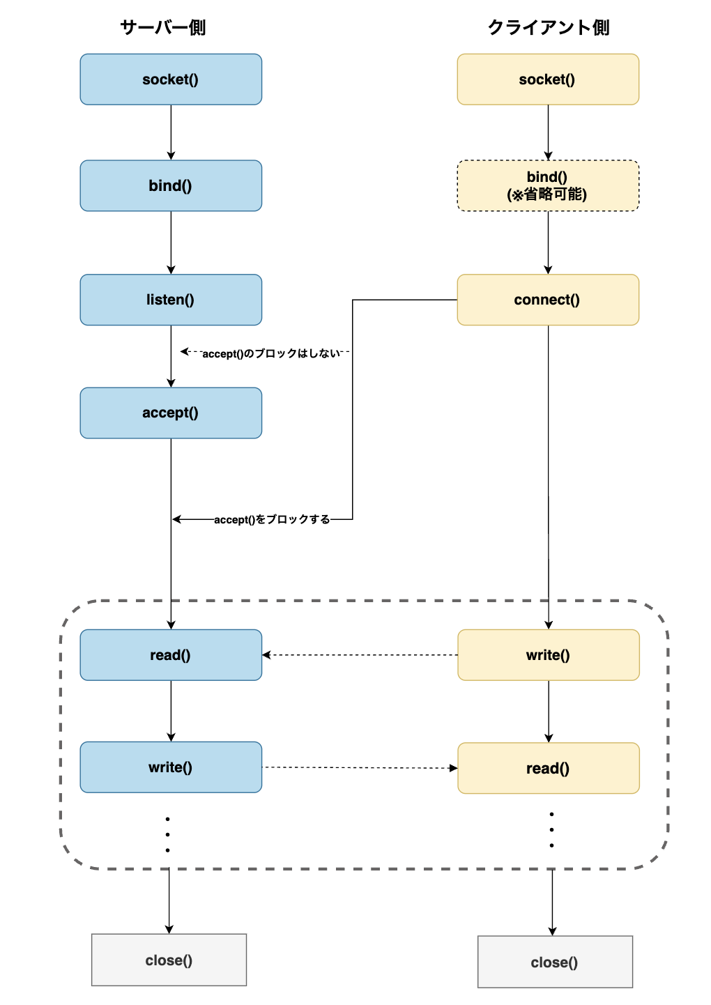 クライアント側 は、この段階では、特に何も行いません。サーバーの準備が整うのを待ちます。場合によっては、クライアント側でもbind()の設定を行います。