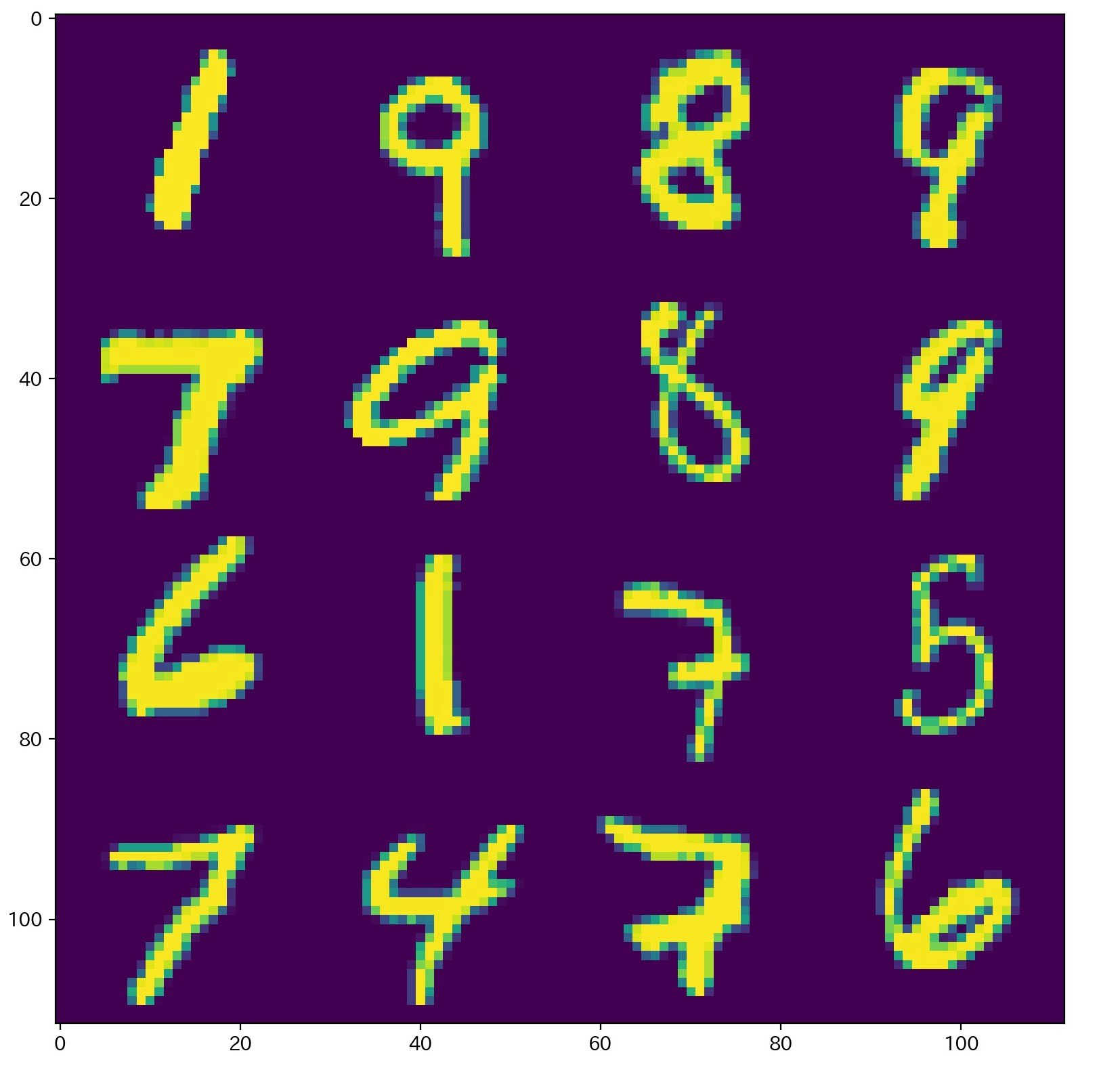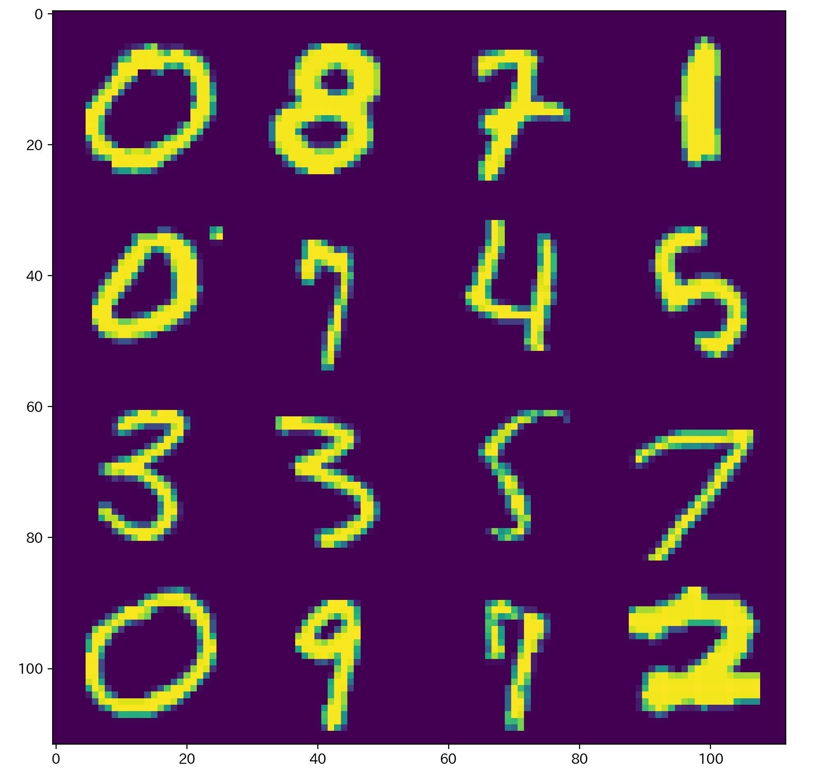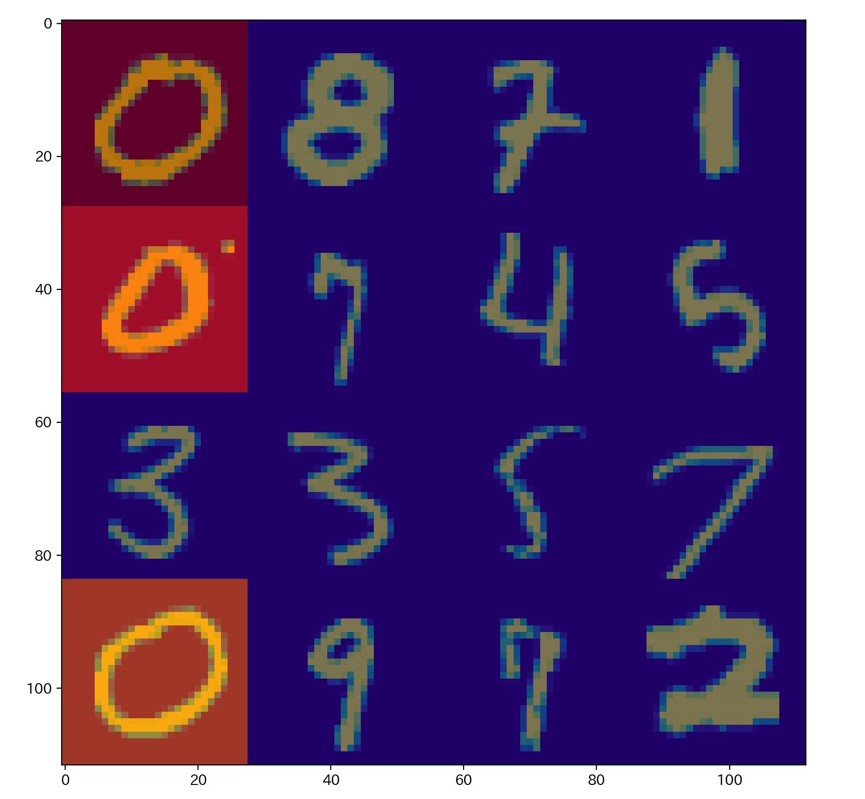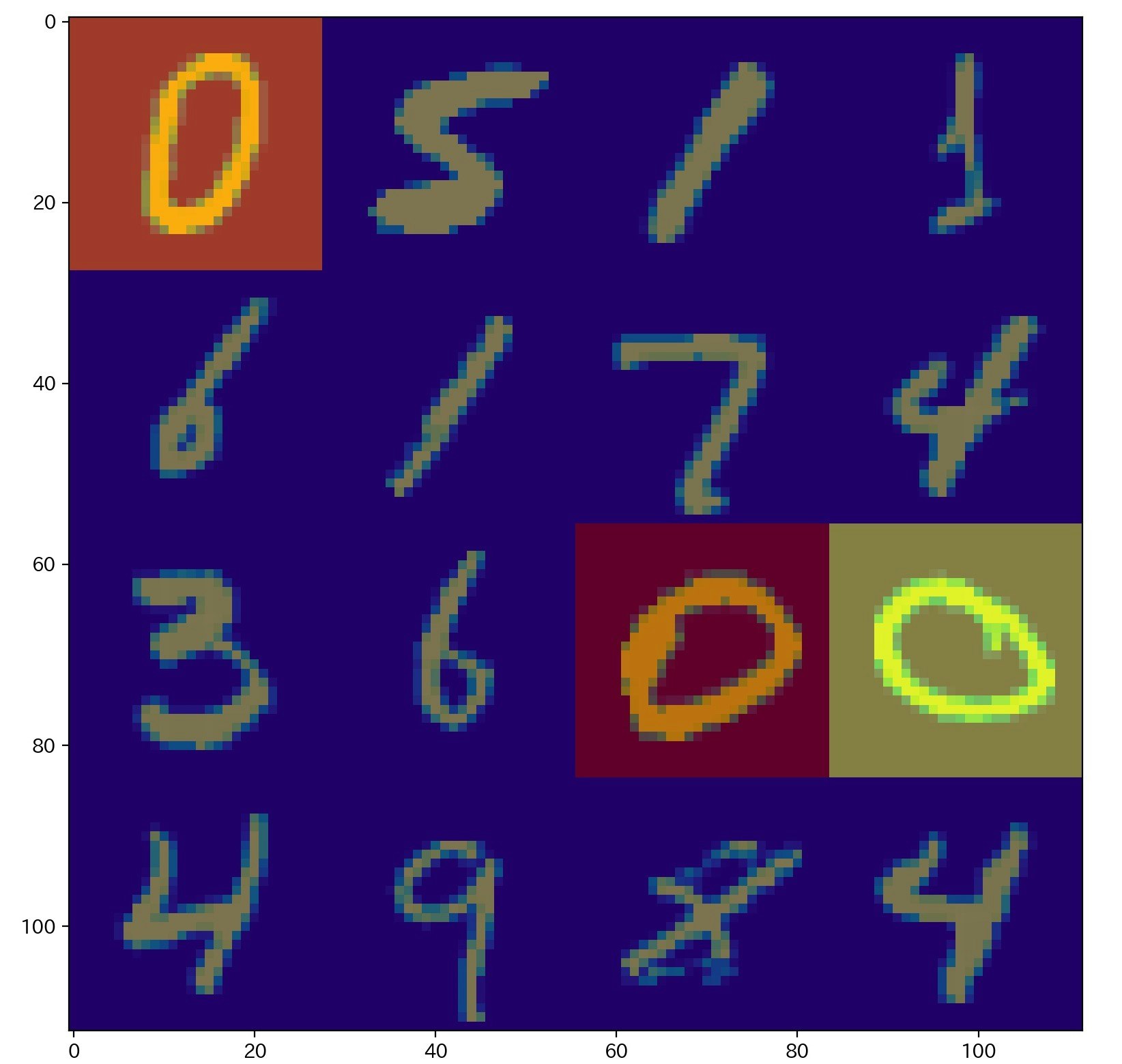 ランダムに MNIST 画像を16枚選び構成した画像を1つの bag としてデータを作成する。ランダムに選んだ16枚の画像のうち、手書き文字 $0$ が含まれているなら positive class 、つまり、 bag のラベル $Y=1$ とする。その他は、Negative class 、bag のラベル $Y=0$ とする。