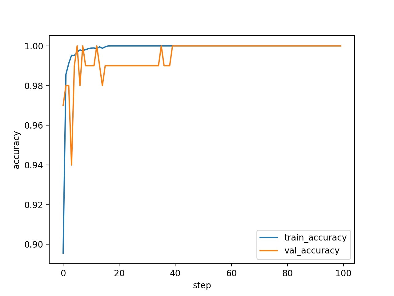 学習曲線は、以下の通りになった。誤差関数の値も収束し、正答率もほぼ100%である。