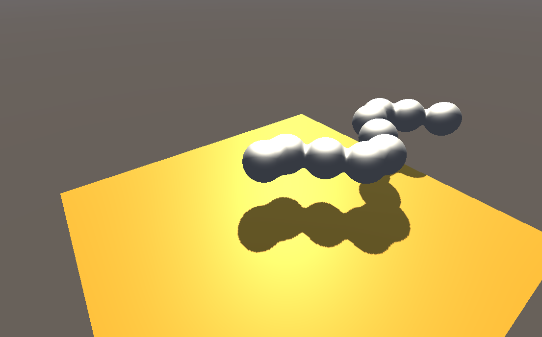 この10個のメタボールからなる形状とその影はRayMarchingで描画しています。黄色の床はUnityのPlaneのGameObjectです。