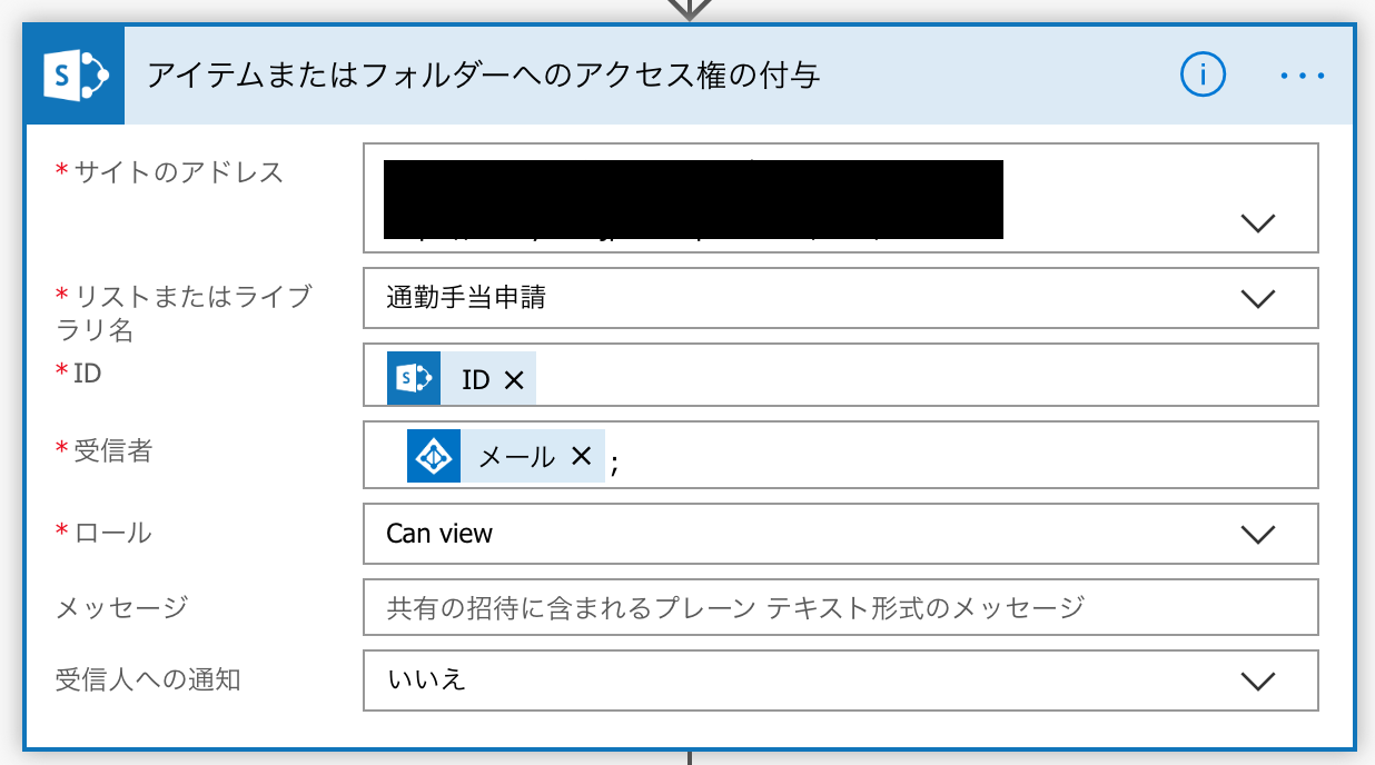 「受信者」は申請者のメールアドレスを指定します。ロールは「Can view」。このアイテムの参照権限を付与したことをメールで通知できるようですが、それは不要なので「受信人への通知」は「いいえ」にしておきます。