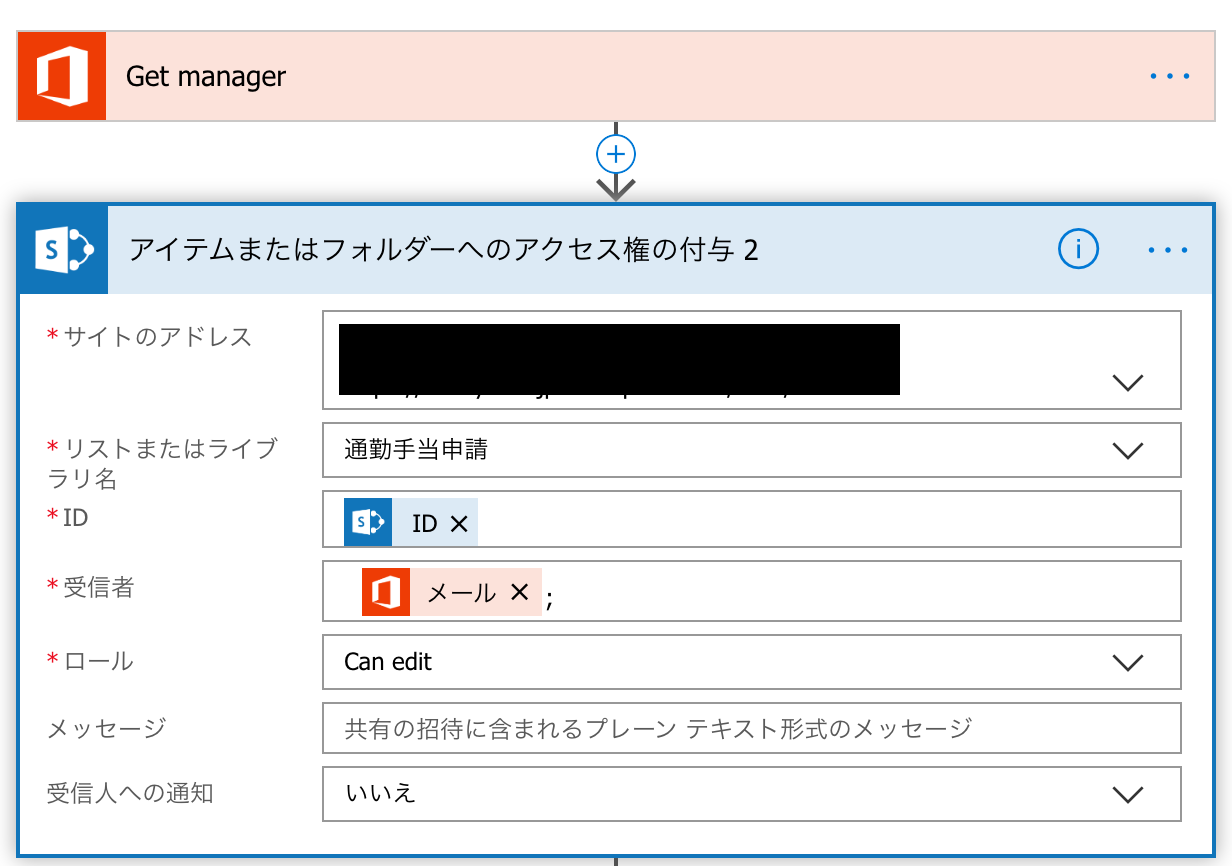 ここでの「受信者」はその上で取得したGet managerの上司のメールアドレスです。ロールは「Can edit」にしています。