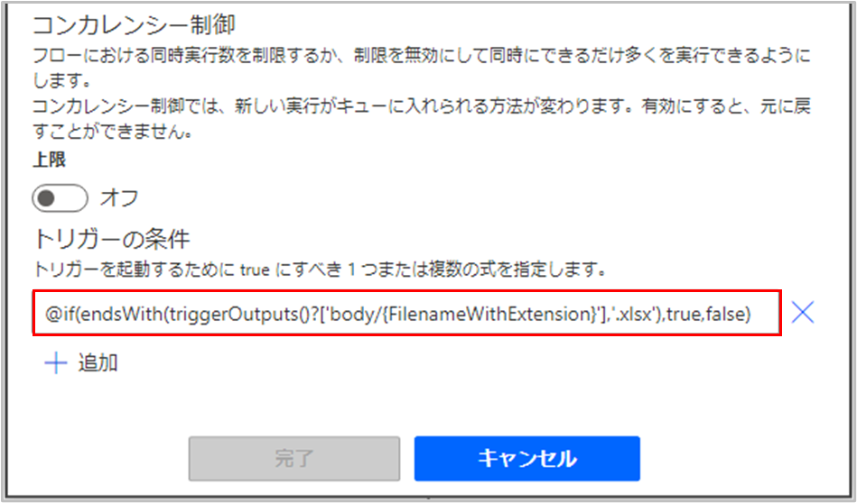 下にある式を トリガーの条件 に追加することで、拡張子.xlsx のファイルに対してのみトリガーすることができます。