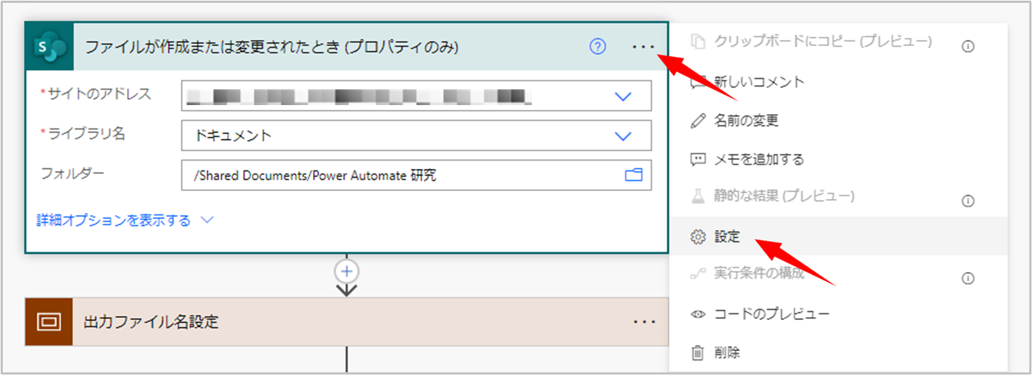 SharePoint ライブラリに Excel ファイルが作成または変更されたとき にフローが実行されますが、フローの最後で SharePoint ライブラリの同じ場所に JSON ファイルを出力しています。このため、JSON ファイルが作成されたとき にもフローが実行され期待しない動作となってしまいます。下手をすれば無限ループになる可能性も・・