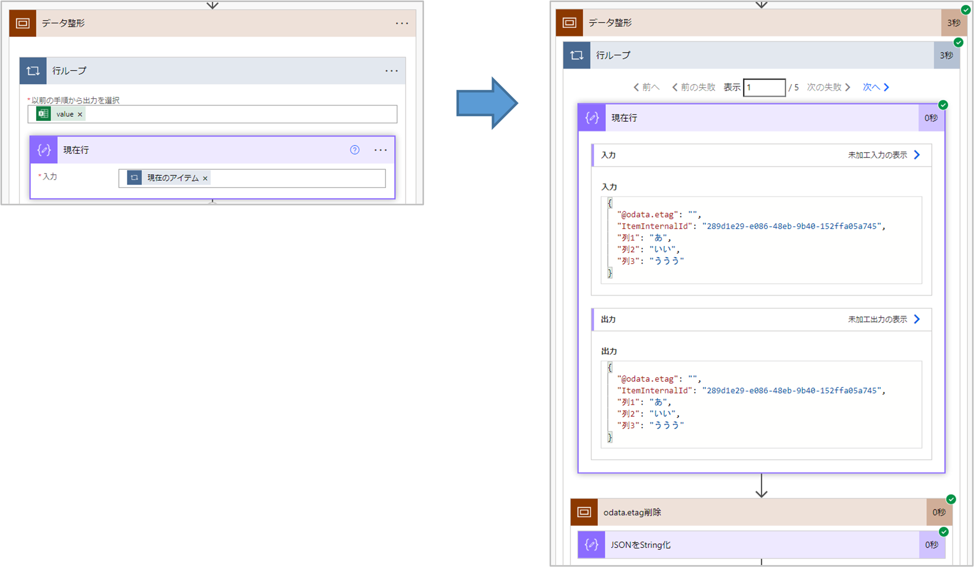 json(replace(string(items('行ループ')), '@odata.etag', '@odata-etag'))