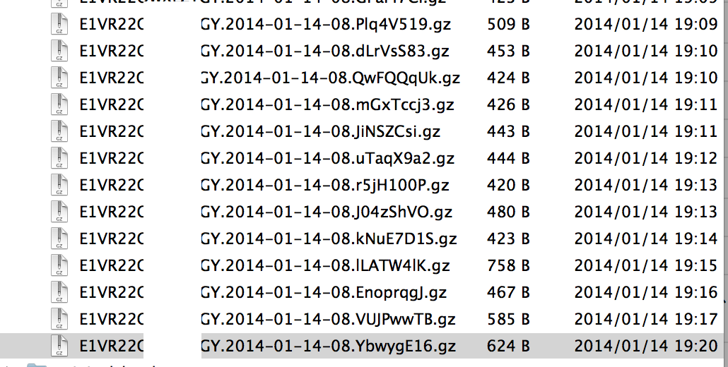 こんな感じで1/14の8時(UTC)台 = 17時(JST)台のログが 19時(JST)台に細切れで生成される。