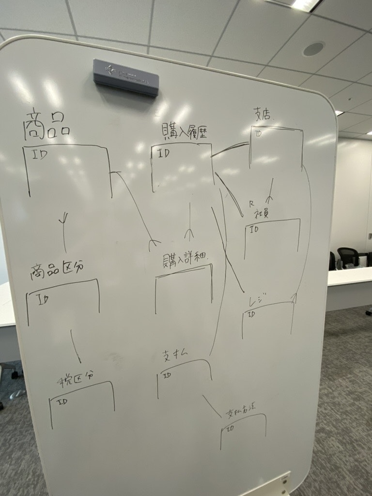 ある程度画面のデザインも決まったところで、DBモデリングを行いました。DBモデリング講義で学んだことを活かして!と言いたいところですが、なかなか意見がまとまらず、かなり時間かかった印象があります。(最初に決めた予定が大幅に後ろ倒しになってしまう…)