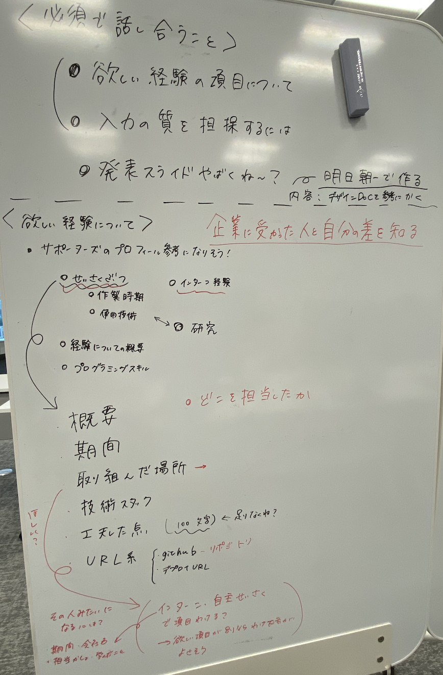 そして締切1時間前になってPDM講師の方から、「結局みんなが欲しいと思う情報ってなんだっけ?」「行きたい企業に受かりたいんじゃないの?」「そのためにはどんな情報を就活生から得れば嬉しいの?」などのフィードバックをいただき、怒涛のDesign Docsの修正に入りました…。