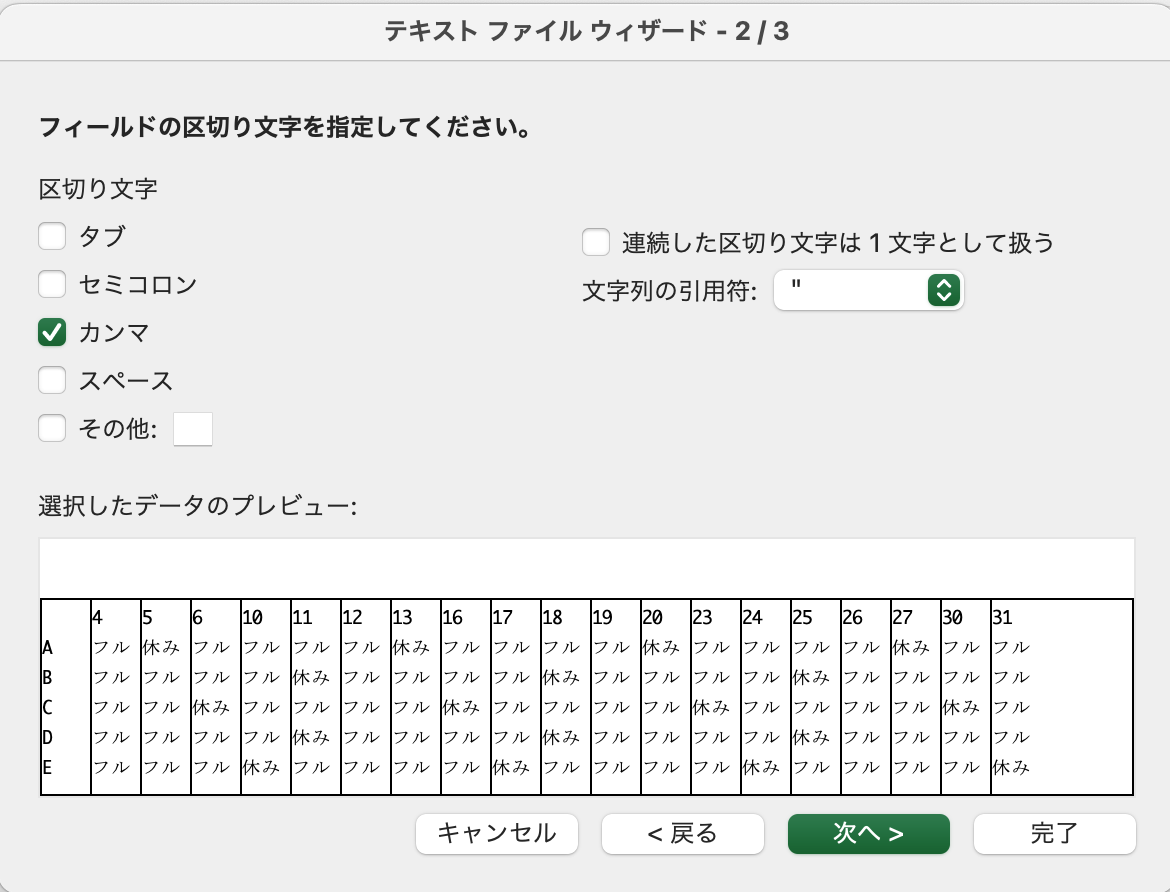 テキストファイルウィザードの選択項目は2/3ページ目の項目を カンマ に変更してください。