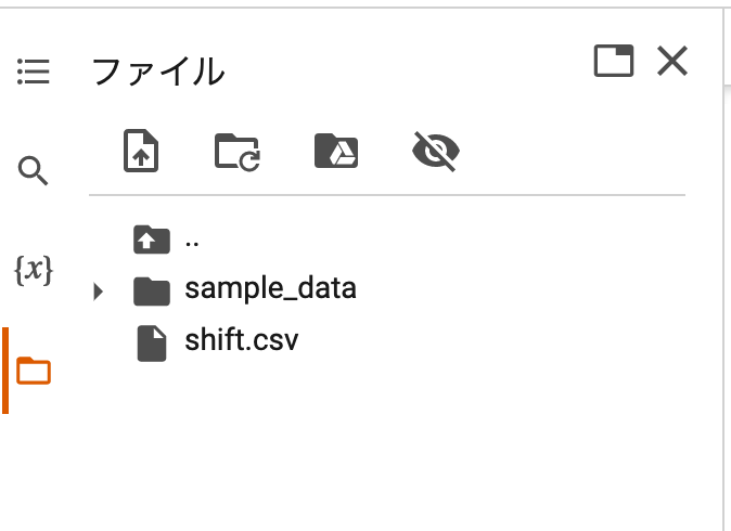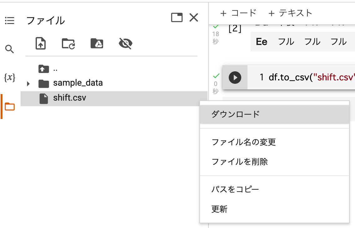 するとGoogle Clabolatoryのフォルダに”shift.csv"といったファイルが出力されます。