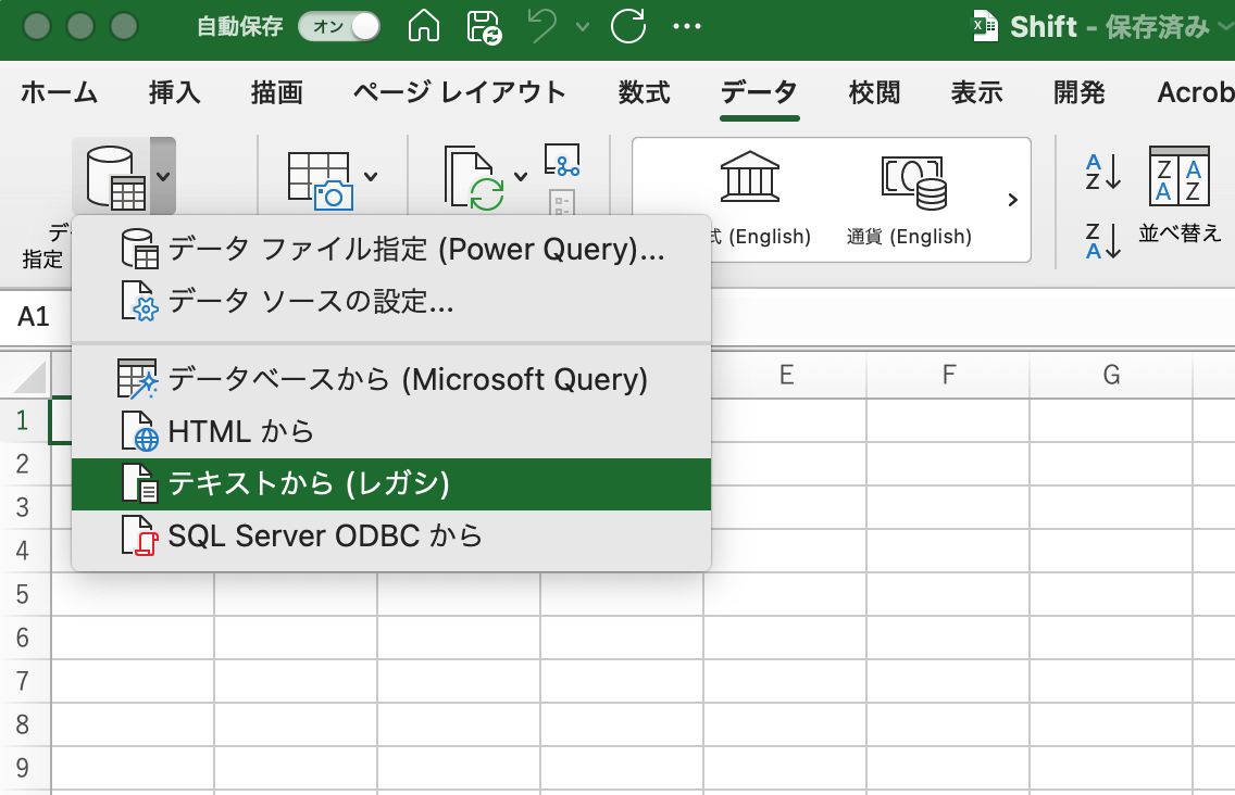 次にExecelで新規作成を選びA1セルに合わせて、データ→データファイルを指定する→テキストから(レガシ)を選択します。そして先ほどダウンロードしたShift.csvファイルを開きます。