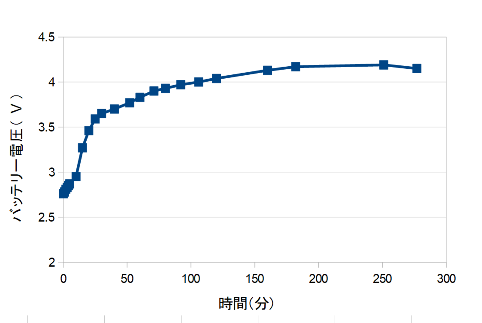 バッテリーに実際に充電を行い。電圧の時間変化を見ていく。