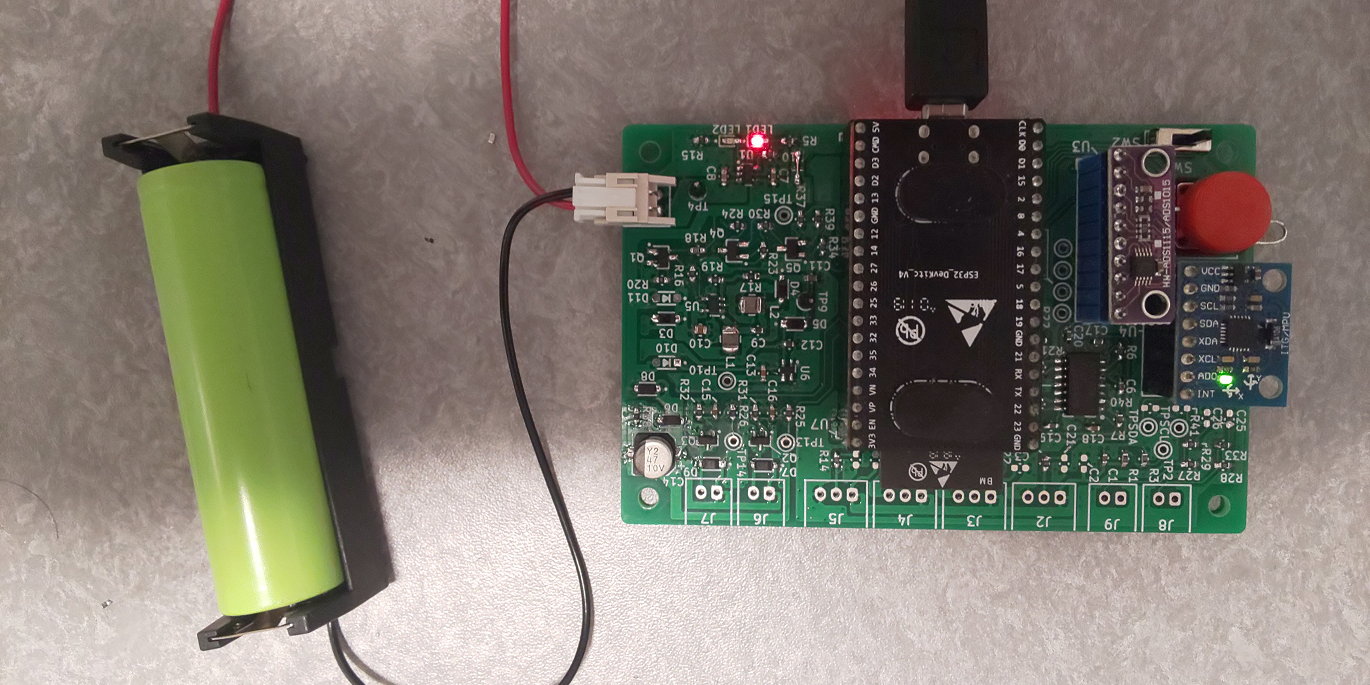 回路のパターン設計、発注、部品実装を行う。ほかにもいろいろ回路を載せているが、充電回路は左上の赤いLEDの周辺にある。