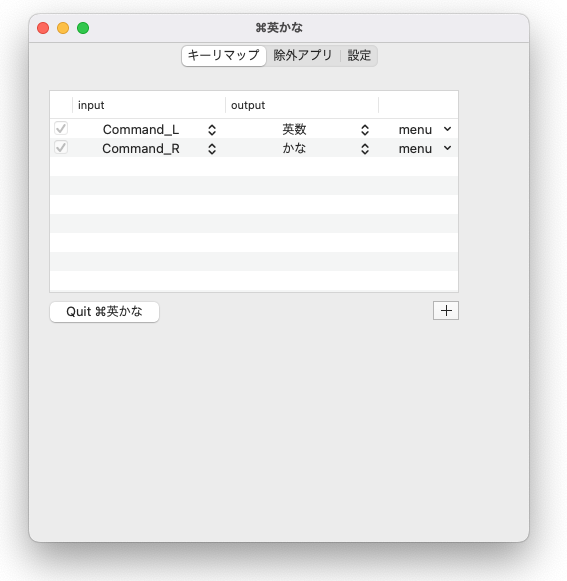 - outpuの列にMacで認識させるキーを選択