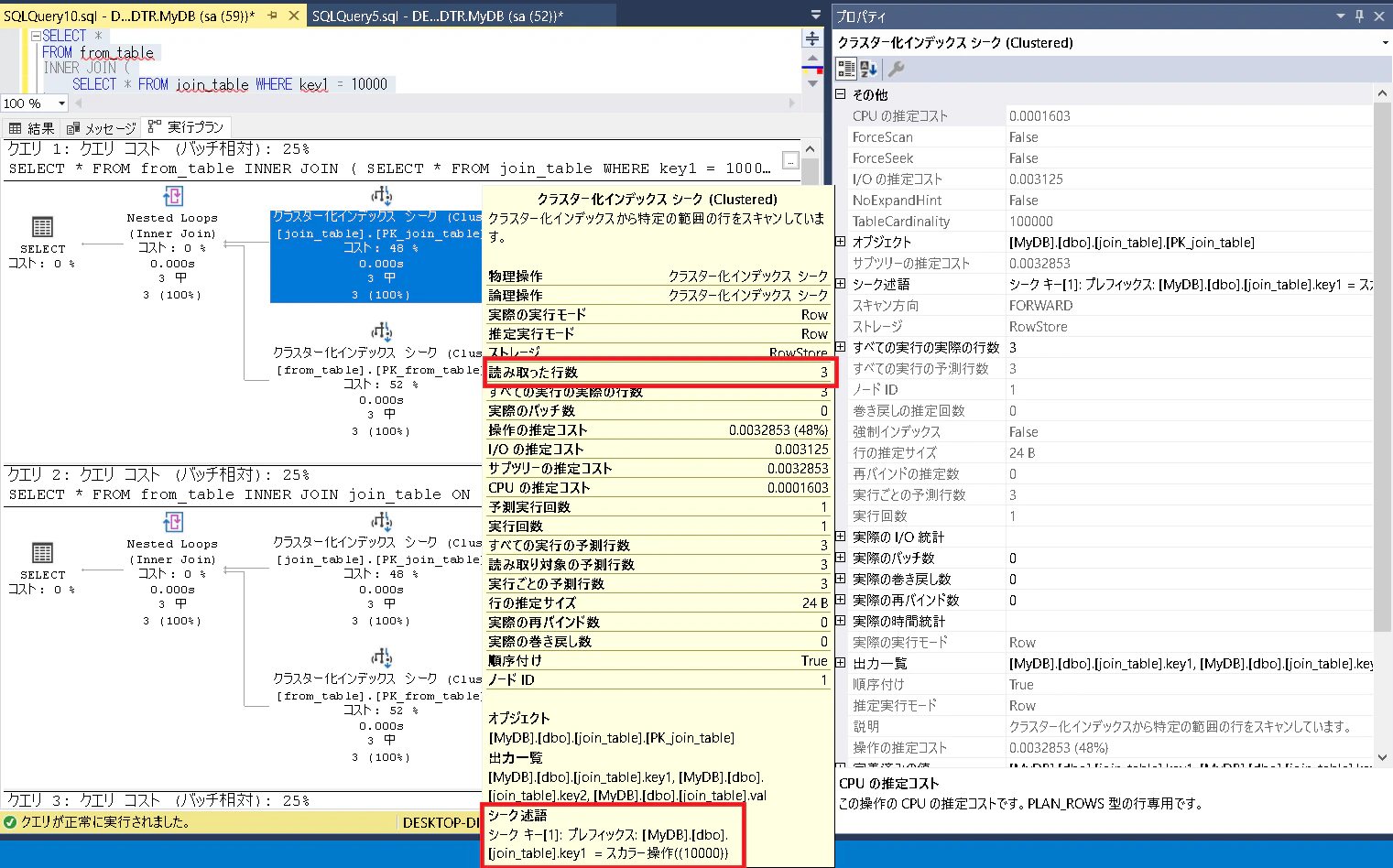 どうクエリを書こうが、[MyDB].[dbo].[join_table].[key1]=(10000)で絞り込んだ上でHash Match(Inner Join~を行っている模様。