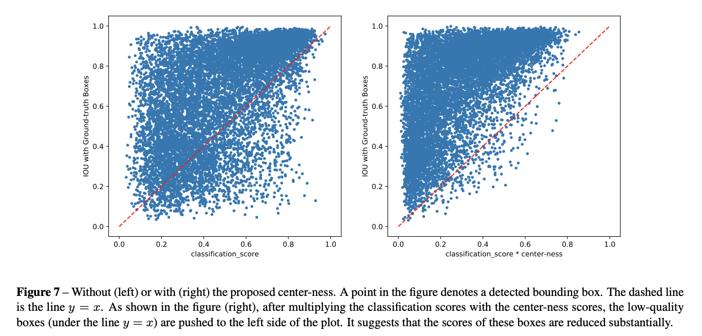 これにより、物体の中心から遠く離れたバウンディングボックスのスコアを低下させることができます。その結果、これらの低品質なバウンディングボックスは、最後のNMSによって高確率でフィルタリングされ、検出性能が著しく向上します。