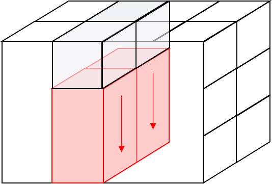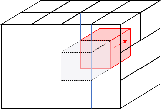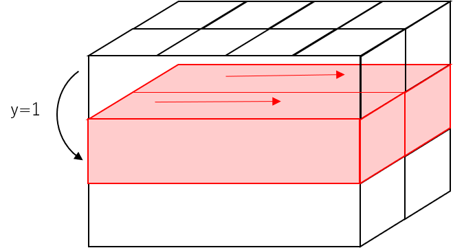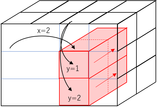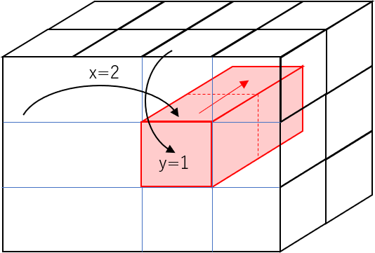 インデックスはdata[z][y][x]のように,zからx方向に並びます.zは最大1,yは最大2,xは最大3となります.本記事における配列の図はすべて,奥行きをz,下方向yを,右方向をxとしています.