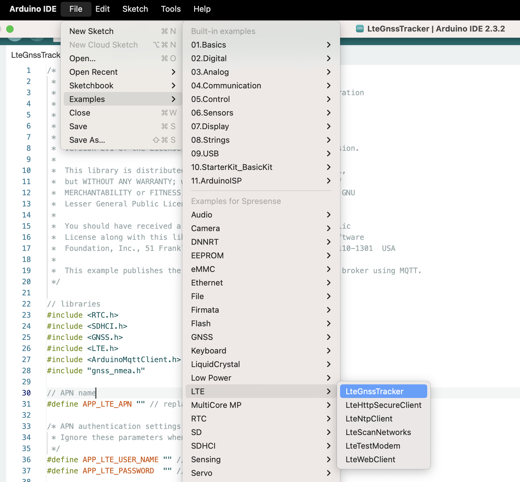 SPRESENSEのサンプルコードのLteGnssTracker.inoを元にし改変していく
