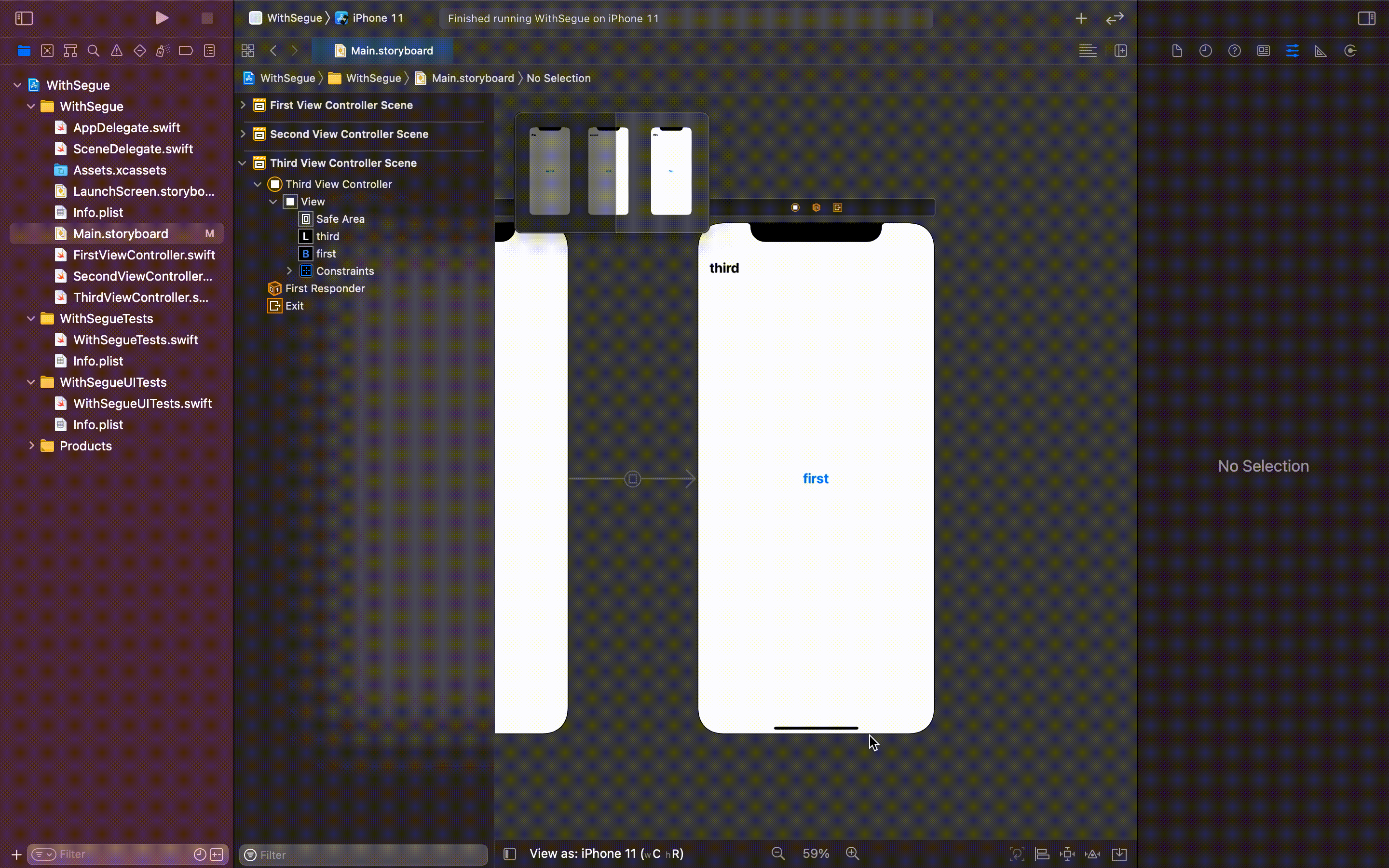 次は遷移元画面(今回はThirdViewController)での作業です。