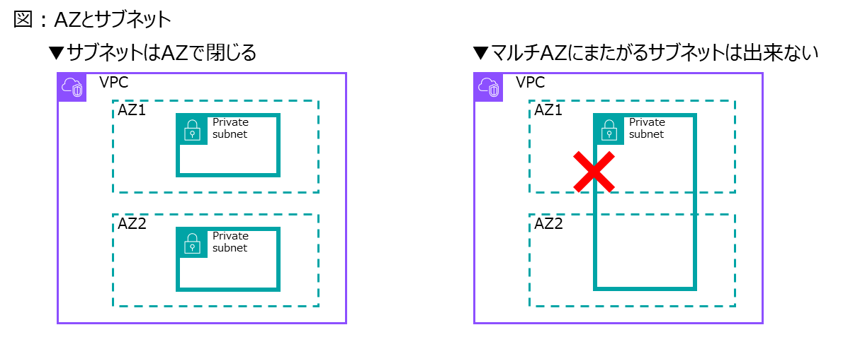 AWSでは、IPアドレスにとらわれずに冗長性や拡張性を確保できる設計思想です。VPCの中にはサブネットがありますが、このサブネットは、AZ単位で閉じています。1つのサブネットは必ず特定のAZに属しています。そのため、AZを跨いで、1つのリージョンで同一のIPアドレスを共有する構成は、AWSの設計思想と整合しない、ということになります。
