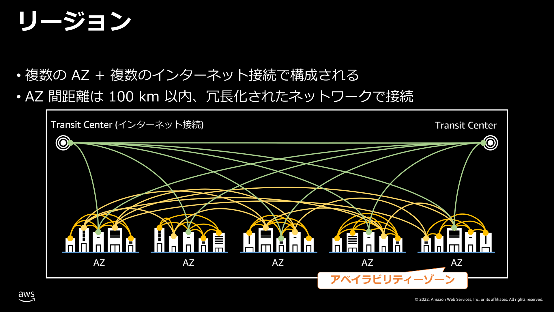 この思想に基づいて、AWSの各リージョンは複数のAZ(Availability Zone)で構成されています。AZはそれぞれ独立した電源・ネットワーク・冷却設備を持つ物理的なデータセンター群であり、AZ単位での障害に備えた冗長構成が可能です。つまり、AZの障害に備えて、単一のAZに依存する構成ではなく、複数AZにまたがってリソースを配置することで、可用性を高める設計が推奨されます。