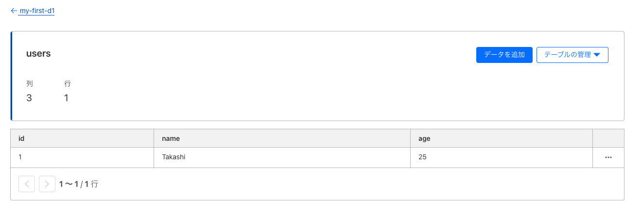 - ダッシュボードのD1 > <データベース名> > <テーブル名> からもレコードが追加されていることが確認できる