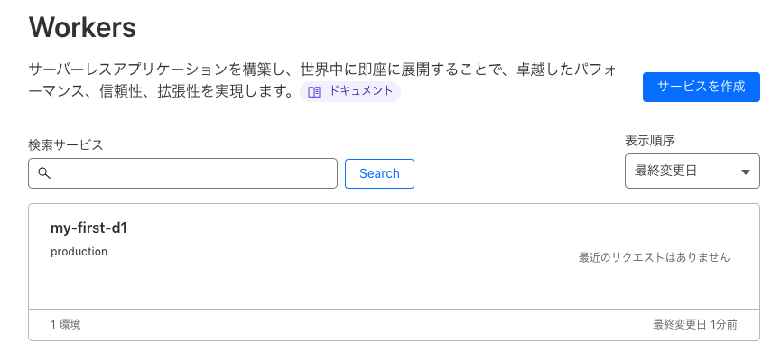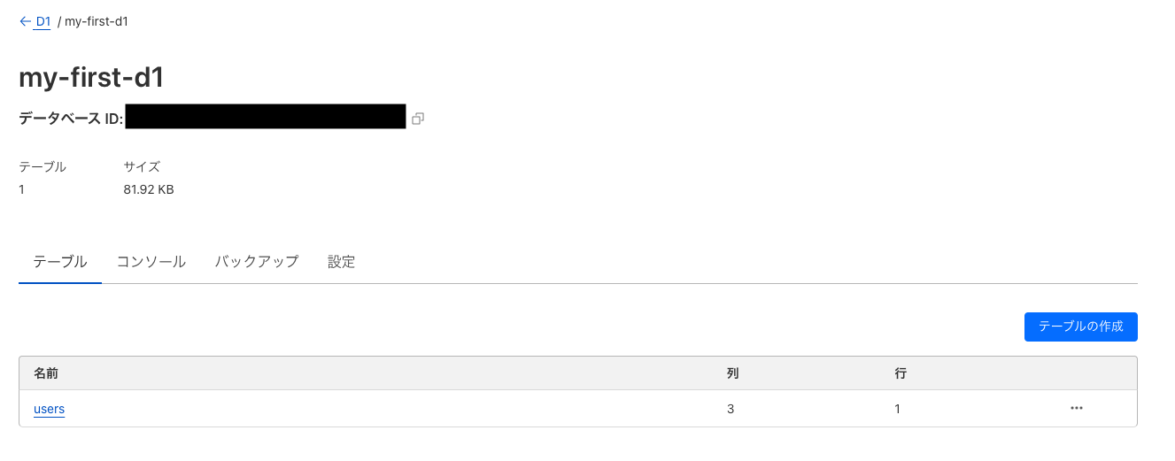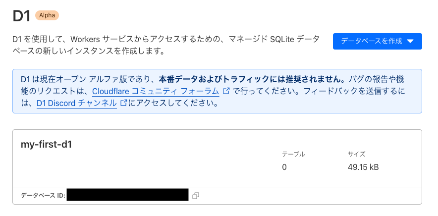 - ダッシュボードのWorkers > D1 からも作成されていることが確認できる