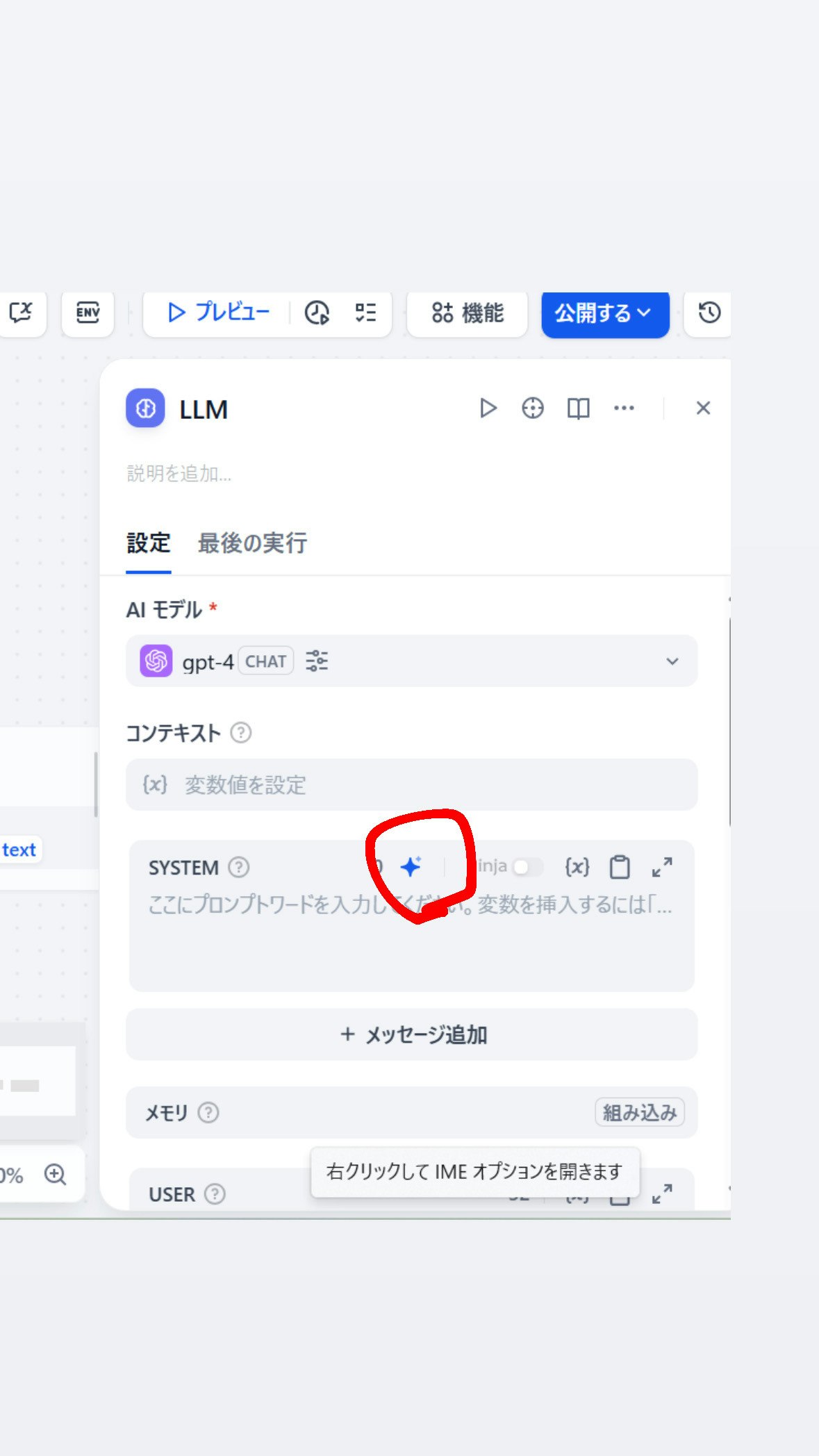 1. {{selected_food}}という変数を用意します。これは、情報を取得したい食べ物を表します。